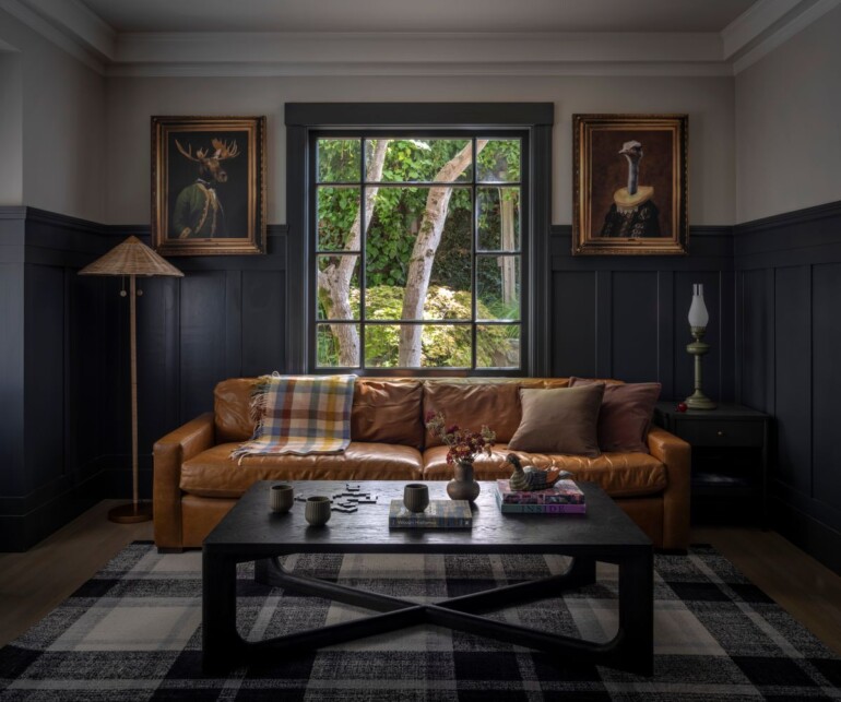 In contrast, the cozy charcoal-paneled den displays a hint of whimsy, with portraits of an Elizabethan-attired ostrich and moose from Lightology displayed above the leather RH couch. “I wanted to add just a little sprinkling of Wes Anderson in there,” Maggio laughs. “The clients ended up loving them. They’re fun people, and they have an underlying sense of humor.”