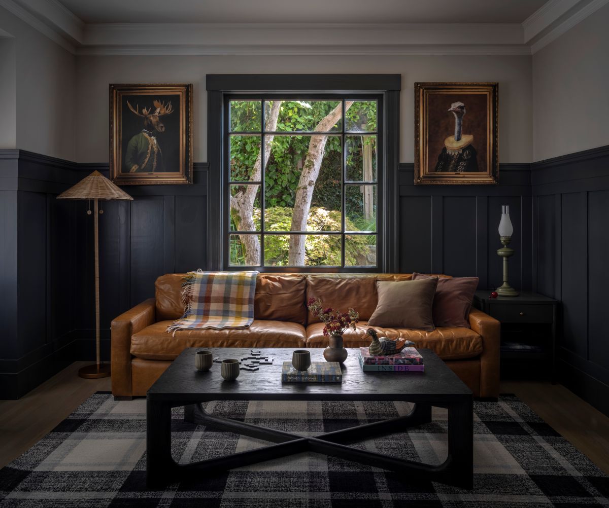 In contrast, the cozy charcoal-paneled den displays a hint of whimsy, with portraits of an Elizabethan-attired ostrich and moose from Lightology displayed above the leather RH couch. “I wanted to add just a little sprinkling of Wes Anderson in there,” Maggio laughs. “The clients ended up loving them. They’re fun people, and they have an underlying sense of humor.”